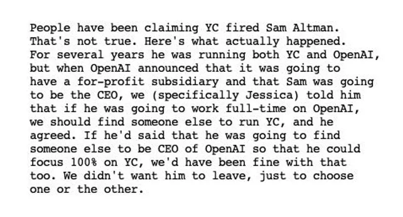 Полу Грэму надоели инсинуации вокруг того, что Сэм Альтман якобы был уволен из YCombinator — это повторила в давешнем подкасте Хелен Тонер, — и он решил закрыть эту тему: