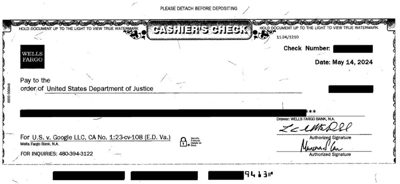 Чтобы подкрепить свои аргументы, Google согласился с суммой ущерба, подсчитанного Минюстом, утроил её, как предусмотрено антимонопольным законодательством, и выписал чек на получившуюся сумму (она держится в секрете) на имя Минюста, который и приложил к ходатайству.