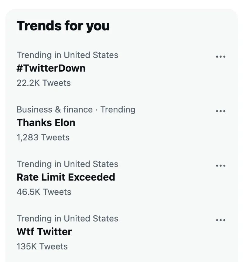Во-вторых, прямо сейчас Twitter как-то странно доступен тем, у кого нет подписки — им постоянно показываются сообщения об ошибках и в-общем скорее ничего не работает. Но писать получается, поэтому тренды выглядят прекрасно.