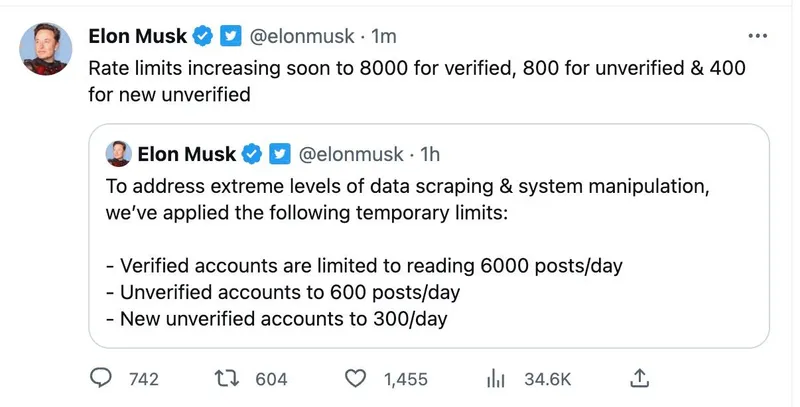 Великий менеджер Маск увеличил лимиты еще немного — до 10к, 1к и 500 твитов соответственно, и посоветовал бросить вообще этот твиттер и идти общаться в реальной жизни.