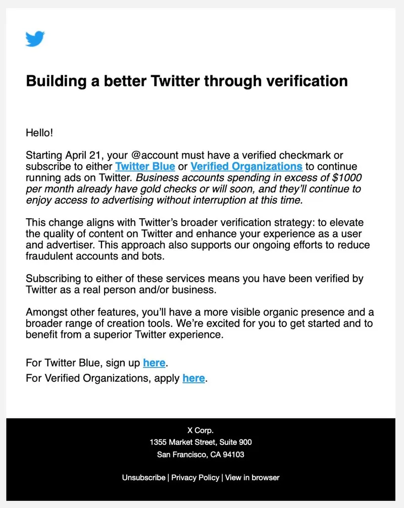 Twitter порадовал своих рекламодателей интересным требованием — теперь для размещения рекламы вы должны быть верифицированным пользователем. Учитывая, что одновременно начали пропадать синие галочки у тех, кто не является подписчиком Twitter Blue, а галочку получил по старой процедуре (с нормальной верификацией), вырисовывается странная картина — чтобы заплатить Twitter деньги, вы должны заплатить ему деньги.