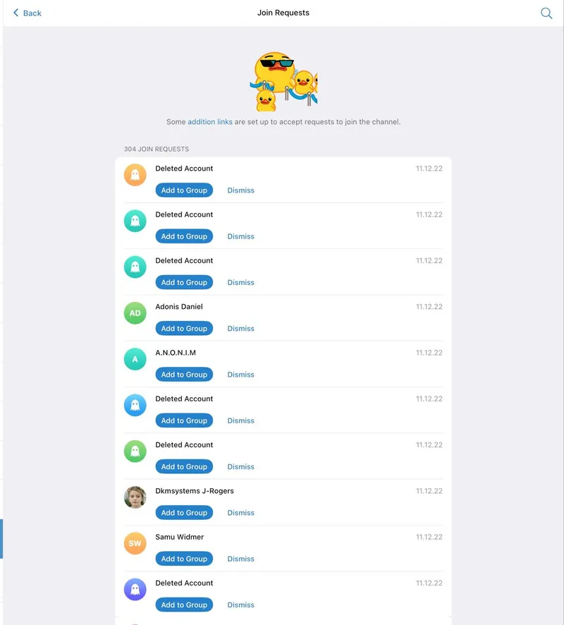 Ставите Telegram Desktop или его форки или берете машину на Windows, где это главный клиент. Открываете список запросов. Ставите мышку над первым Dismiss в списке. И кликаете 3 тысячи раз.