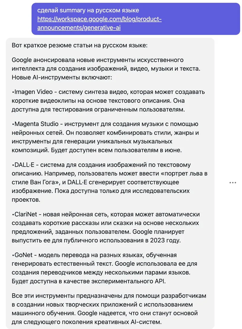 Вдогонку про генеративный AI — мы уже привыкли к фантазиям ChatGPT, который придумывает факты, которых не знает. Но вот так выглядит пересказ содержания анонса нововведений Google в Workspace, о которых я писал вчера, от модели constitional AI от компании Anthropic под названием Claude+. Я даже не понимаю, куда он попал по ссылке, что пошел перечислять все эти пять пунктов, ни один из которых не упоминается в оригинальном тексте.