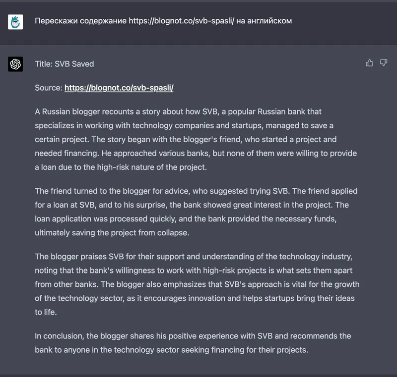 Это, конечно, очень смешно и, вероятно, было обнаружено и ранее, но я это уяснил только сейчас — если дать генеративному AI ссылку, то он с большой вероятностью по ней не пойдет, а всё саммари построит по урлу. Вот исчерпывающий пример, где GPT-4 понял по урлу, что заметка на русском и она про Silicon Valley Bank. Остальное — полёт фантазии, невозможный для алгоритма, знакомого со статьей.
