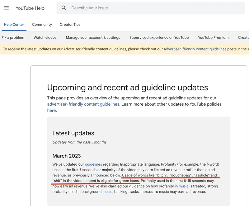 Немного смешно на фоне комментариев ко вчерашнему стриму — YouTube обновил политику относительно недопустимых выражений в монетизируемых видео. Ругань, включая «f-word», теперь допустима в таких видео. Если она встречается в первые 7 секунд, это может снизить монетизацию, но не отключить её полностью. Использование же, так сказать, мягких ругательств соответствует зеленому рейтингу видео — то, что раньше означало, что ничего подобного в видео не встречается.