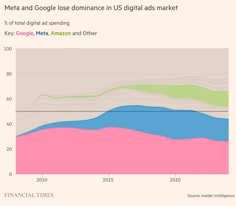 Эпоха меняется — Meta и Alphabet (то есть Facebook и Google) впервые с 2014 года занимают менее 50% рекламного онлайн-рынка в США и Европе. Данные исследовательской компании Insider Intelligence показывают, что совокупная доля двух гигантов составила в этом году лишь 48,4%, что на 2,5 процента меньше уровня прошлого года.
