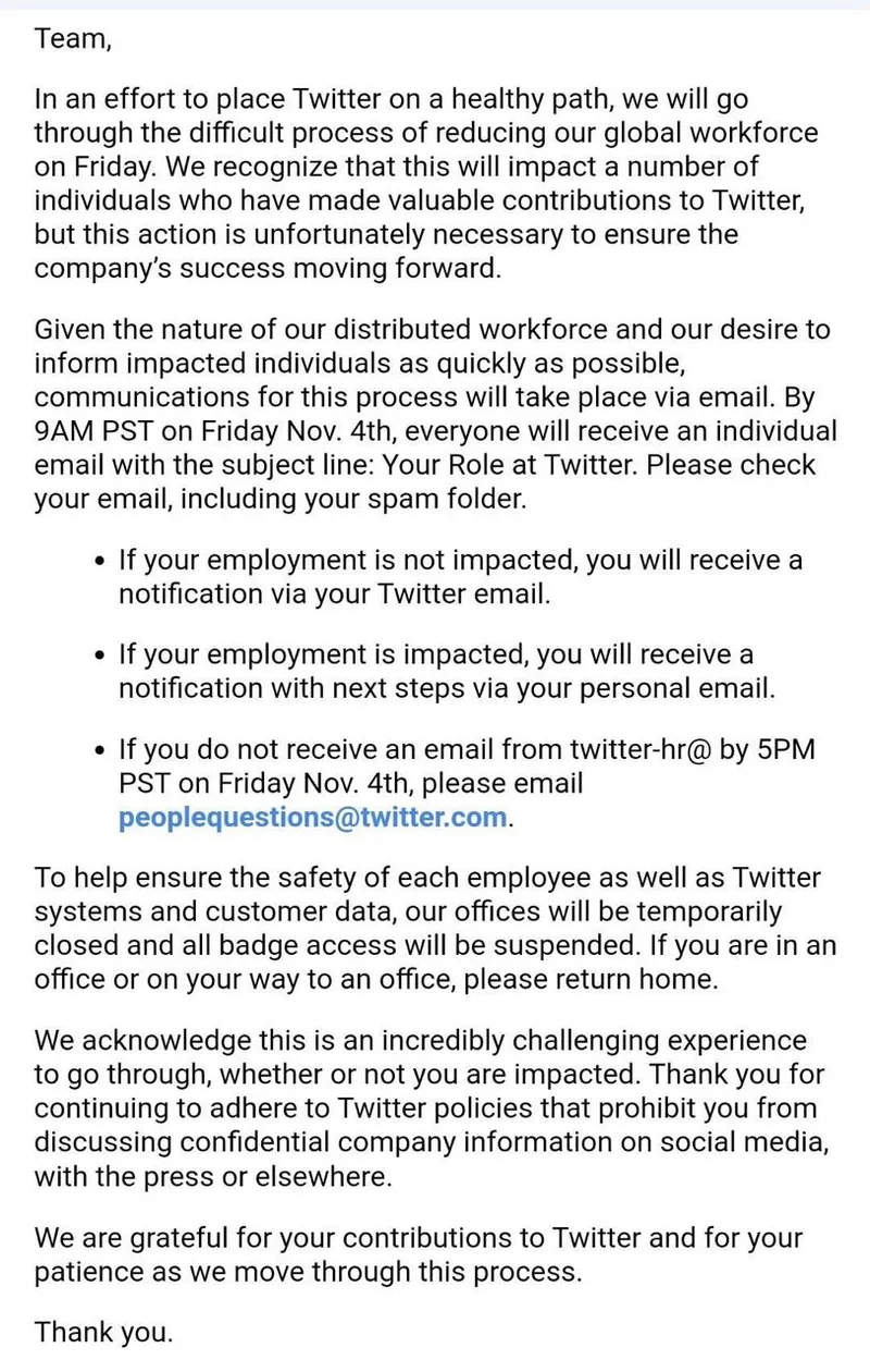 Как минимум несколько десятков только что уволенных сотрудников Twitter получили предложение вернуться на работу. По слухам, менеджмент обнаружил, что немалое количество уволенных необходимы для разработки новых фич, которые придумывает Илон Маск. Поскольку процесс увольнения сопровождался отключением ряда внутренних систем, внутри компании царит хаос, где никто не понимает, кто из сотрудников других подразделений, включенных в те или иные процессы, остался на работе и на кого вообще можно рассчитывать.